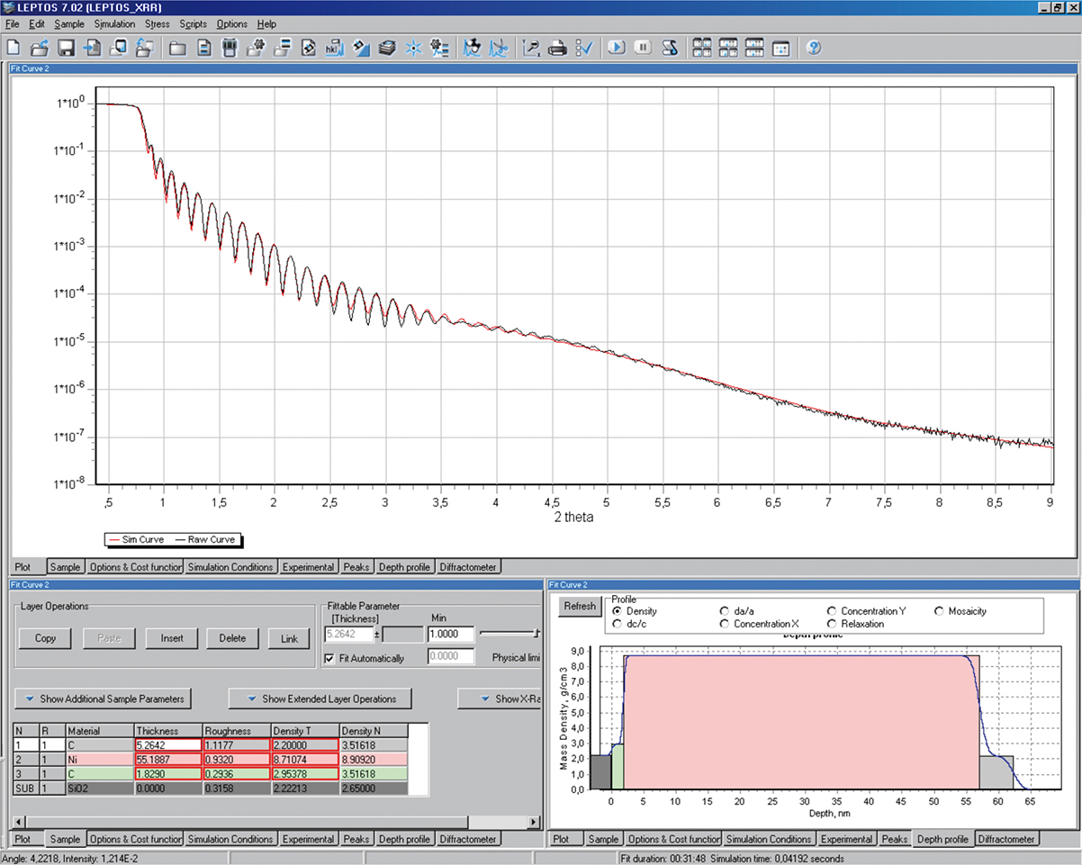 6)在DIFFRAC.LEPTOS中,對(duì)多層樣品的薄膜厚度、界面粗糙度和密度進(jìn)行XRR分析。