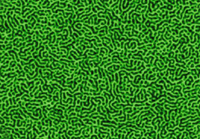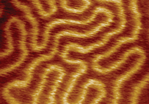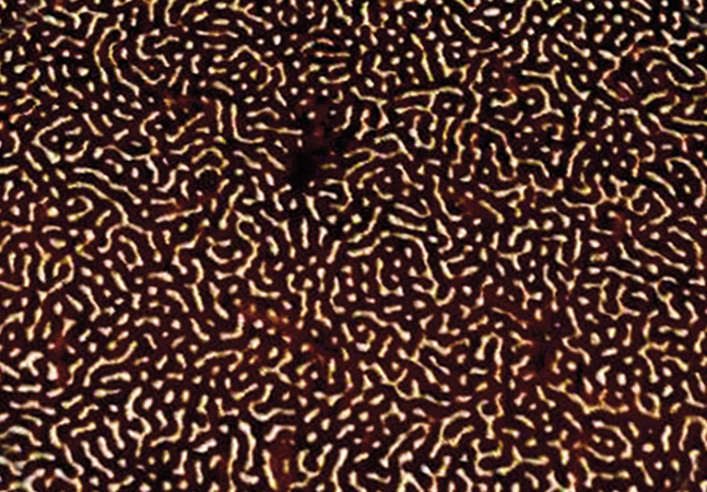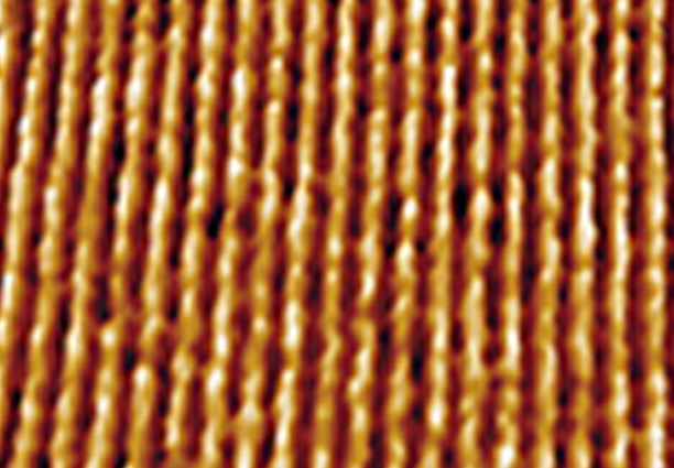 5)HOPG上C36H74烷的閉環(huán)相位圖像。清晰可見的片層結(jié)構(gòu)間距,與C36H74鏈的長度間距(±4.5nm)一致。圖像大小130nm