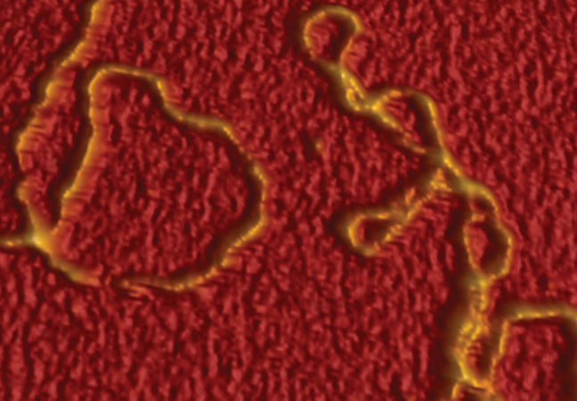 7)緩沖溶液中DNA的原位智能模式(ScanAsyst)掃描圖像。圖像大小500nm。