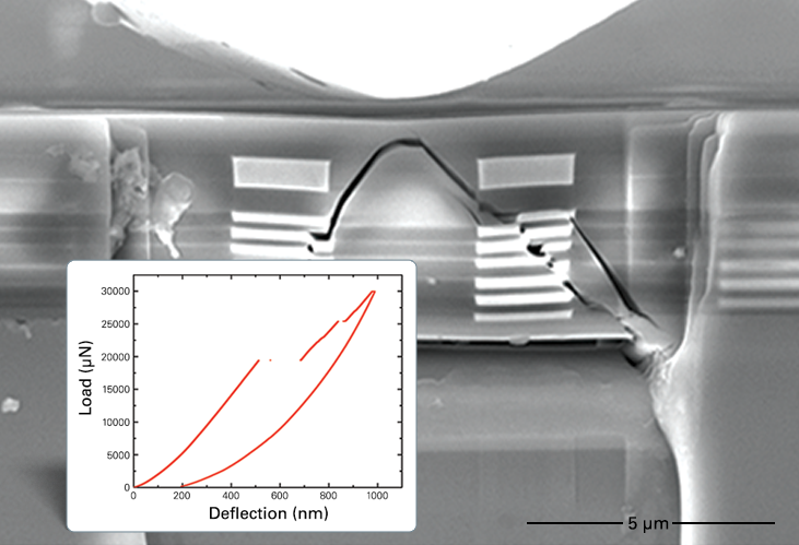 使用 Hysitron PI 85L 采集的原位力學(xué)數(shù)據(jù)與 SEM 成像同步,且并排顯示。同時(shí)進(jìn)行機(jī)械測(cè)量和SEM成像可全面了解材料變形行為。
