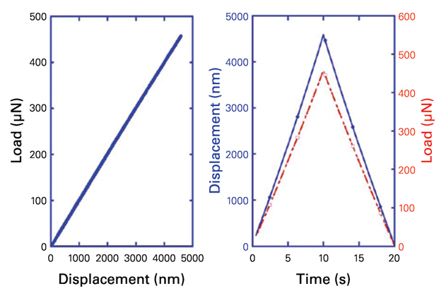 4)金屬薄膜 1 Hz 動(dòng)態(tài)載荷測(cè)試中應(yīng)用的載荷振幅(紅色)和總位移(藍(lán)色)的圖示