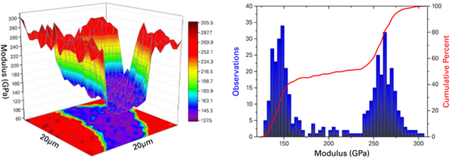 2)Ceramic matrix composite modulus map composed of 400 measurements in 67 seconds (left). Ceramic matrix composite modulus distribution statistics (right)