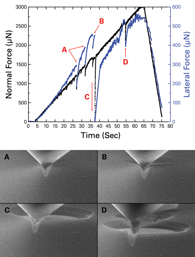 4)在傾斜的法向載荷劃痕測試期間記錄的法向和橫向力數(shù)據(jù)(上圖),以及顯示變形和失效各個階段的SEM同步視頻的圖像(下圖):(A)兩對垂直于劃痕路徑的裂紋;(B)分層事件和探針前方的可見彎曲;(C)分層區(qū)域的剝落/彈出;和(D)探針到達第一個剝落區(qū)域遠端產(chǎn)生的第二次剝落/分層事件