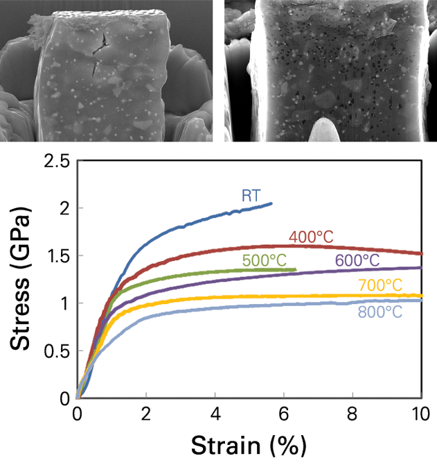 3)在室溫(左上)和 800℃(右上)環(huán)境中粘結涂層柱子壓縮后的形貌。在室溫下測試的柱子中可以清楚地看到穿晶破裂,而在高溫下才出現(xiàn)晶間破裂。應力應變曲線(下圖)表明在室溫下有較大的應變硬化,而在較高的溫度下更為有限