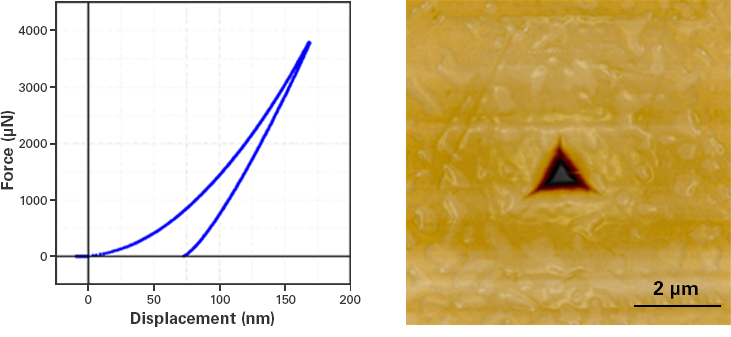 2)熔融石英上的力與位移曲線顯示彈塑性材料的典型響應,并在準靜態(tài)納米壓痕測試后通過原位SPM成像,顯示殘余壓痕形貌