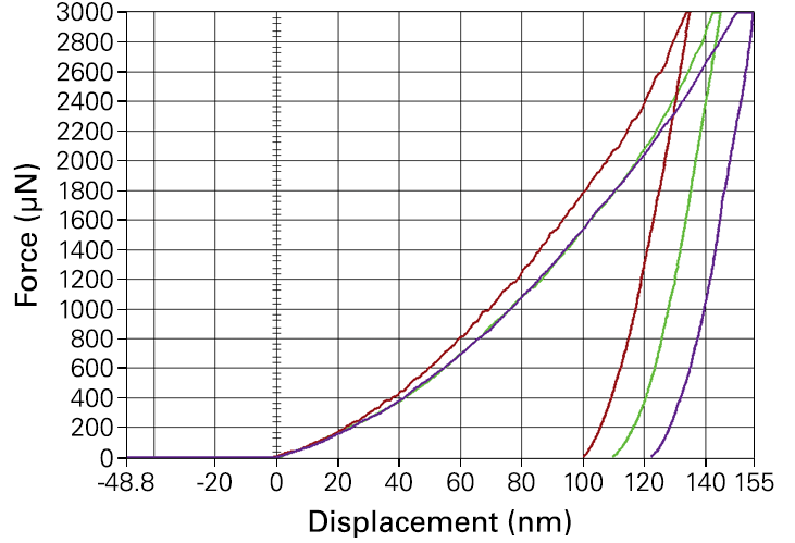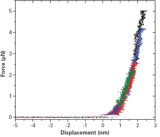 1)(100) 硅上的五個載荷納米壓痕系列測試,顯示了 Hysitron TI Premier 納米力學測試系統(tǒng)業(yè)界領(lǐng)先的噪聲水平、性能和數(shù)據(jù)可重復性