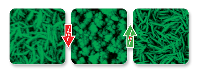 2)五氧化二氨薄膜的輕敲圖像,掃描范圍為5um。薄膜用作鋰微電池中的正極,并在原始狀態(tài)(左)、第一次放電后(中間)和隨后充電后(右)進(jìn)行測(cè)試。充電/放電循環(huán)不可逆地改變了薄膜結(jié)構(gòu)。圖片由法國(guó)波城大學(xué)的B. leutot提供。