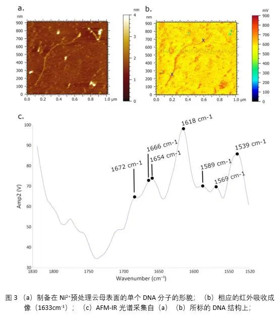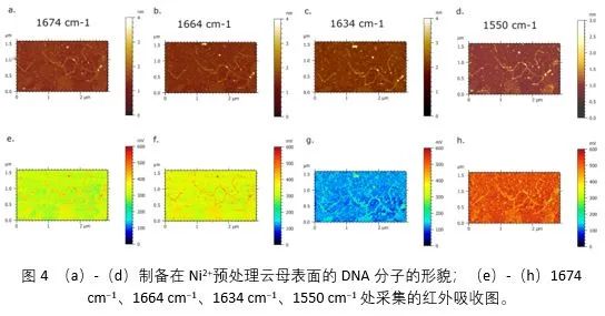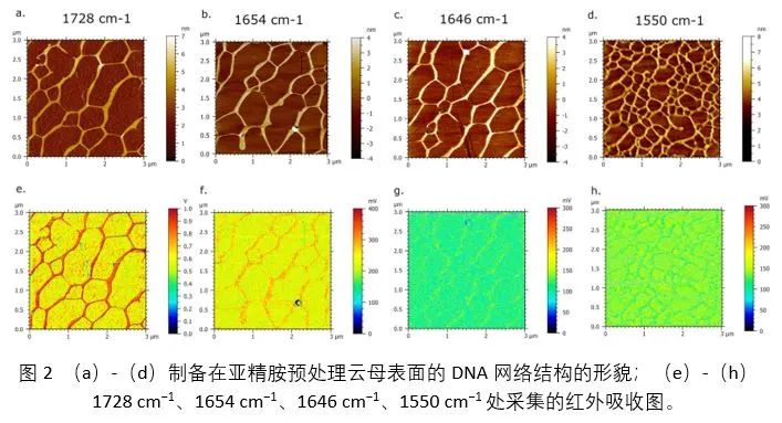 作者采用亞精胺和Ni2+預(yù)處理云母表面,隨后沉積DNA分子結(jié)構(gòu),采用納米紅外光譜技術(shù)分別對(duì)兩種DNA分子結(jié)構(gòu)進(jìn)行納米尺度化學(xué)表征。