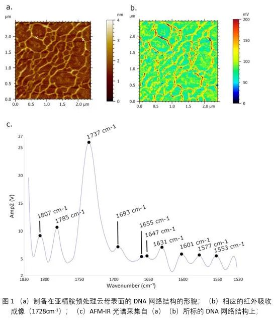 作者首次使用AFM-IR以超高的空間分辨能力和靈敏度成功表征了DNA網(wǎng)絡(luò)結(jié)構(gòu)和單個(gè)DNA分子的納米光譜和吸收成像。作者認(rèn)為,AFM-IR納米光譜技術(shù)可以成為化學(xué)修飾DNA和核蛋白復(fù)合物的光譜和成像表征的有效方法。