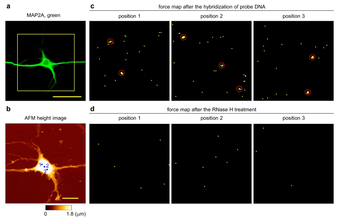 圖4 在固定的神經(jīng)元上繪制miR-134分布。(a)海馬神經(jīng)元(DIV7),MAP2;綠色。(b)a中的方框區(qū)域進(jìn)行原子力顯微鏡成像。(c)b中編號(hào)的區(qū)域在與miR-134互補(bǔ)DNA雜交后進(jìn)行粘附力實(shí)驗(yàn)。(d)相同的區(qū)域在用相同的探針進(jìn)行RNase H處理后重新測(cè)試,未觀察到團(tuán)簇。(c, d)黃色像素表示在五次測(cè)量中觀察到特定粘附力超過(guò)一次的位置(100 × 100像素,1.0 × 1.0 μm2)。a中的比例尺為50 μm,b中的比例尺為20 μm。