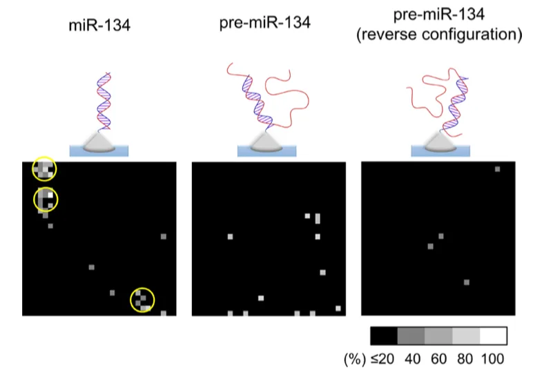 作者將N末端的人RNase H1蛋白通過(guò)表面修飾的方法固定在原子力顯微鏡針尖上。這種蛋白可以結(jié)合RNA/DNA雜交雙鏈,稱(chēng)為雜交結(jié)合域(hybrid binding domain, HBD),在這里作者使用結(jié)構(gòu)更穩(wěn)定的DNA探針而不是RNA來(lái)檢測(cè)mRNA。在實(shí)驗(yàn)中,修飾后的探針用于檢測(cè)一種腦特異性miRNA,miR-134。這是一種能夠調(diào)節(jié)脊椎生長(zhǎng)和樹(shù)突生成的腦特異性miRNA。