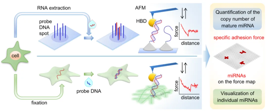 圖1 上半部分:為了定量化檢測(cè)特定miRNA,從單個(gè)細(xì)胞中提取總RNA,并使目標(biāo)miRNA與探針DNA點(diǎn)雜交;下半部分:在固定的單個(gè)細(xì)胞上繪制特定miRNA的原位分布,并使探針DNA與固定的miRNA雜交。利用連接HBD的原子力顯微鏡探針產(chǎn)生的力-距離力曲線(xiàn)中的特定粘附力來(lái)識(shí)別miRNA/DNA雜交物。單個(gè)的miRNA/DNA雜交物在粘附力圖上呈現(xiàn)為一簇像素。實(shí)驗(yàn)方法