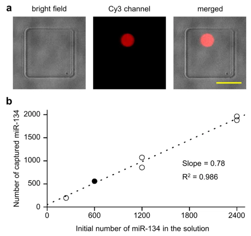 圖3 DNA斑點(diǎn)上的miR-134。(a)在方格圖案化的玻璃片上生成的探針DNA(在3'端修飾Cy3)斑點(diǎn)的共聚焦顯微鏡圖像。比例尺,10 μm。(b)在單獨(dú)的DNA斑點(diǎn)上檢測(cè)10-100 aM(240-2400個(gè)拷貝)的miR-134(30 × 30像素,300 × 300 nm^2)。觀察到特異性miR-134力曲線(xiàn)數(shù)量與樣品溶液中miR-134的初始數(shù)量之間呈線(xiàn)性相關(guān),并且從線(xiàn)性回歸的斜率計(jì)算出捕獲效率為78%。(一個(gè)實(shí)心圓表示兩個(gè)數(shù)據(jù)點(diǎn)重疊。)