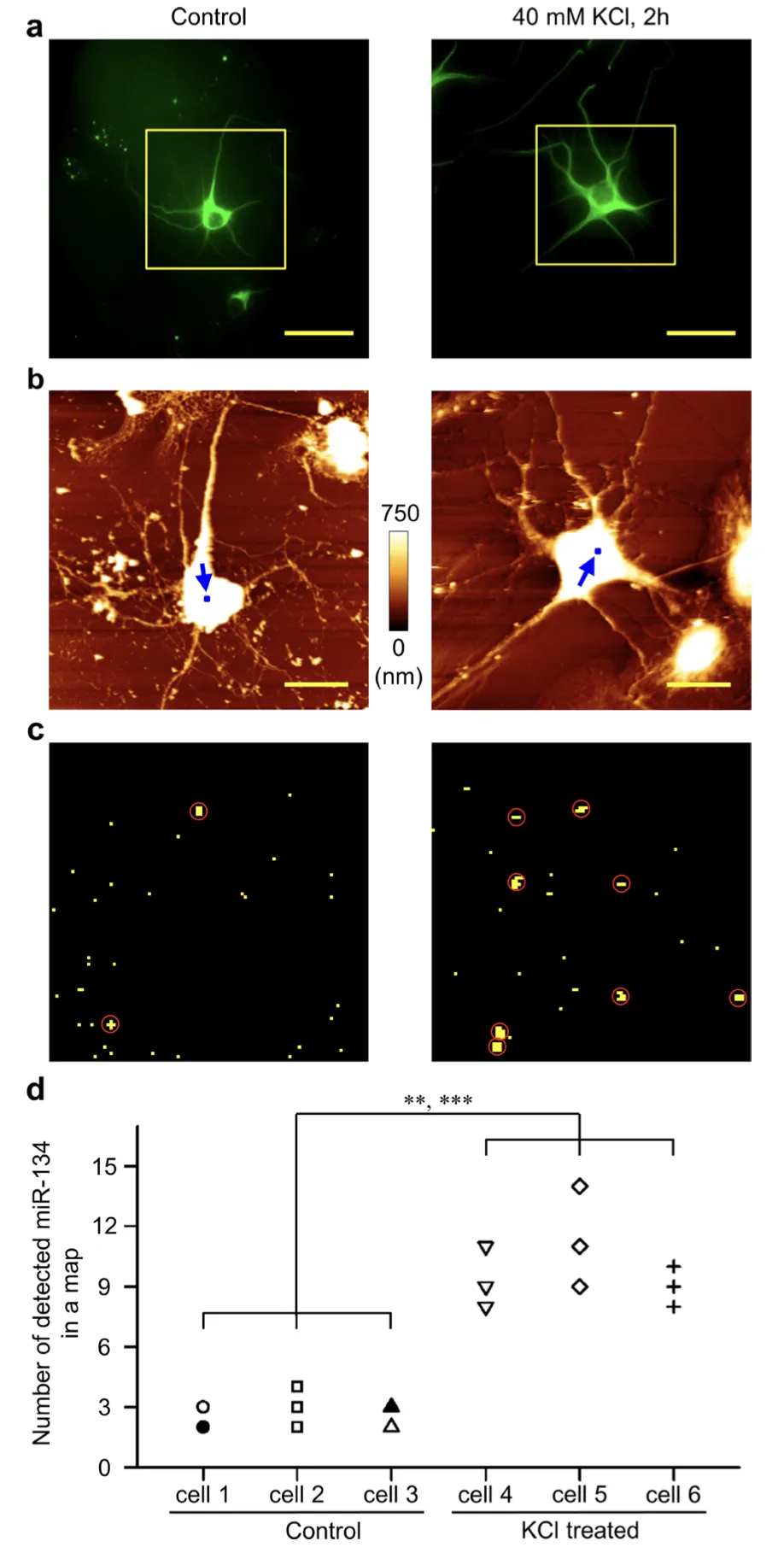 圖5 神經(jīng)元細(xì)胞通過(guò)膜去極化誘導(dǎo)增強(qiáng)表達(dá)miR-134。(a)未受刺激的海馬體DIV7細(xì)胞與在固定前經(jīng)過(guò)40 mM KCl 2小時(shí)刺激的細(xì)胞。二者均經(jīng)過(guò)MAP2免疫染色。(b)原子力顯微鏡圖像。a比例尺50 μm,b比例尺20 μm。(c)在神經(jīng)元體上隨機(jī)位置測(cè)試得到的粘附力圖像。測(cè)試位置在b中用藍(lán)色箭頭標(biāo)注。(100 × 100像素,1.0 × 1.0 μm2)特異性粘附力產(chǎn)生概率超過(guò)20%的區(qū)域用黃色標(biāo)注,團(tuán)簇用紅色圓圈標(biāo)注。(d)在三個(gè)神經(jīng)細(xì)胞上分別進(jìn)行了三個(gè)不同位置的miR-134團(tuán)簇檢測(cè)。1.Visualization and Quanti?cation of MicroRNA in a Single Cell Using Atomic Force Microscopy